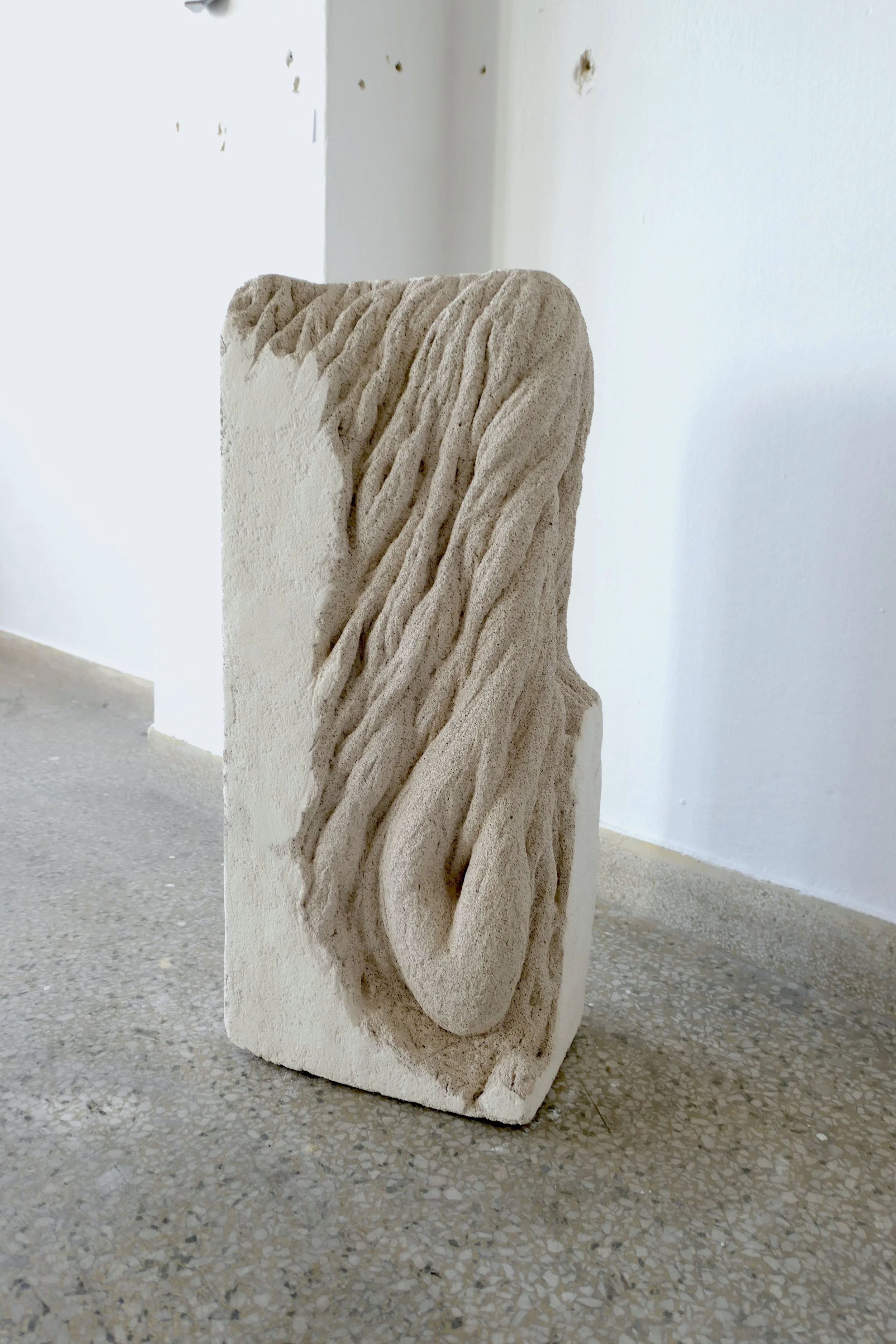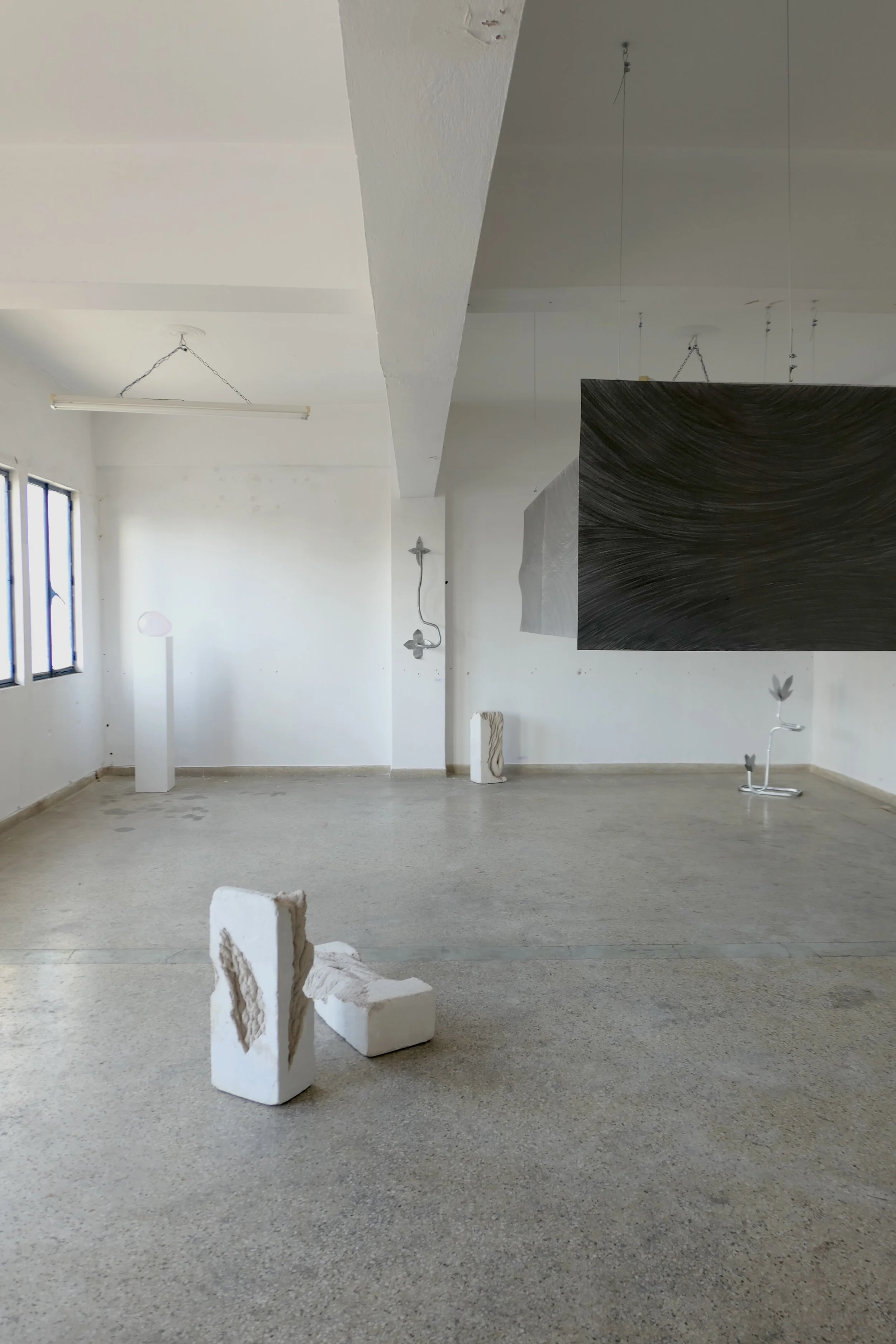 [….]Katerina Papazissi, living and working in Greece, explores the tension between the body, nature, and the unconscious. In her large-scale triptych, movements unfold between sky and earth, abstract bodies suspended between matter and dissolurion. The dry pastel powder she uses suggests both the sensation of touch and the transience of flesh as it transforms into dust. In Transmutation, Papazissi works with lightweight concrete and plaster, materials of architecture, shaping them into organic forms. She captures the moment when the made becomes aive, dissolving the separation between human and nature. It is a corrosion from within, a return of the repressed, and a poetic breach of the boundary between the artificial and the living.